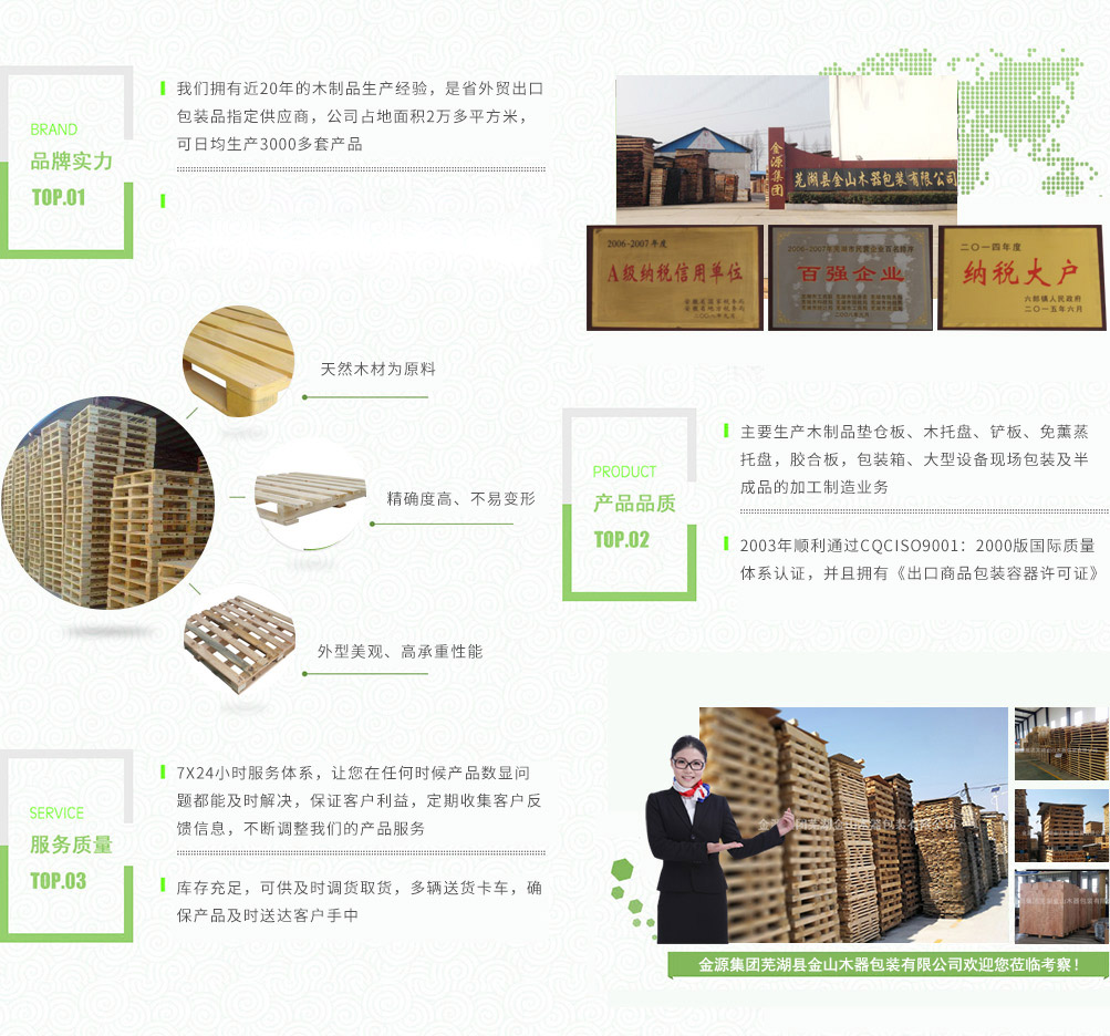 金源集團蕪湖金山木器包裝有限公司是省外貿出口包裝品指定的供應商,主要生產木制品墊倉板、木托盤、鏟板、免薰蒸托盤,膠合板,包裝箱、大型設備現場包裝及半成品的加工制造業務。產品廣泛用于物流,倉儲,港口,碼頭,機械,建材,化工,紡織,食品,超市,五金電器等行業。公司占地面積2萬多平方米,注冊資金壹佰壹拾捌萬圓整,公司擁有員工160多人,其中技術人員占25%,可日均生產3000多套產品,年產值6000多萬元,公司下轄木材加工廠,組裝廠,并備有大型標準烘房,多功能平板刨,壓刨,挖槽,機械設備等。產品主要銷往國內大中型城市并隨貨通行出口國外。